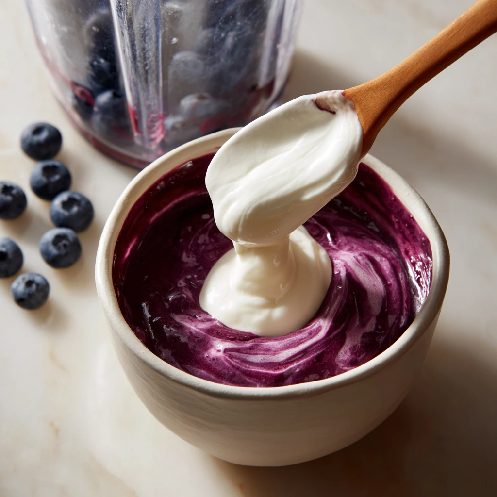 In a large bowl, gently fold the blueberry puree into the Greek yogurt until the color is uniform and no streaks remain.