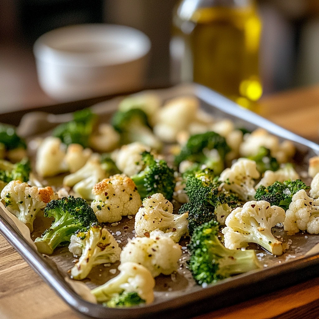 In a large bowl, toss cauliflower and broccoli with olive oil, salt, pepper, and minced garlic. Spread on a parchment-lined baking sheet.