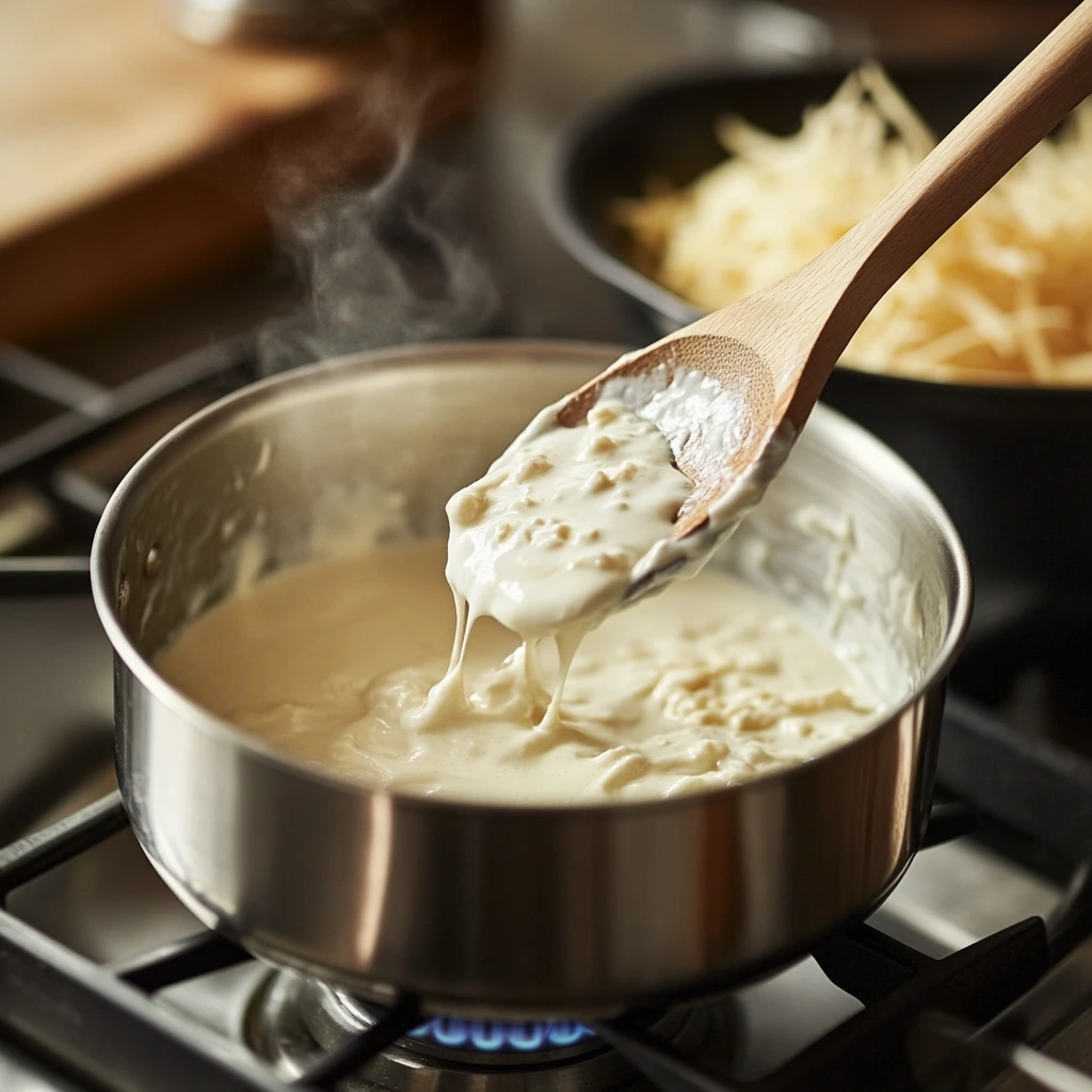 Once the base is smooth and slightly thickened, reduce the heat to low. Gradually add your shredded cheese in batches, stirring constantly so it melts evenly. You’ll end up with a creamy, velvety sauce. -