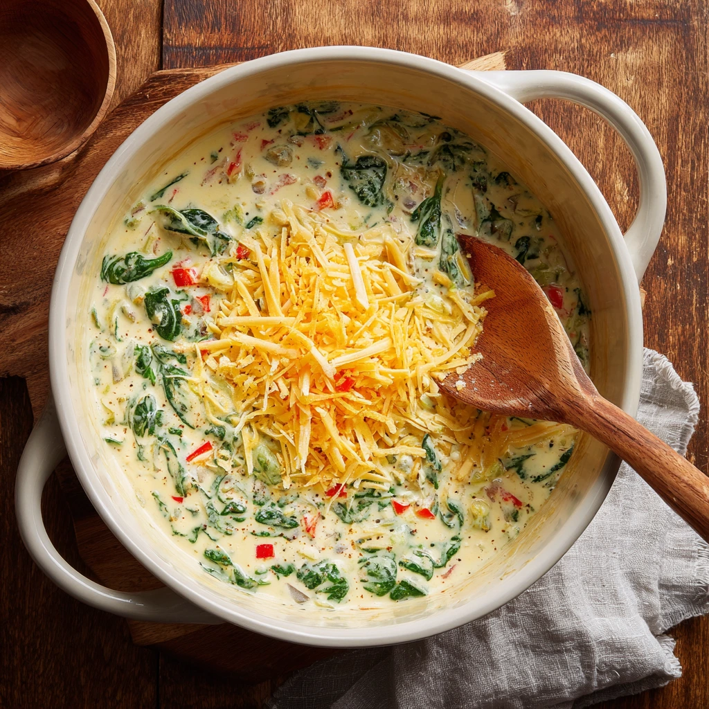 Once your egg mixture is well combined, stir in 1 cup of shredded cheddar cheese, or use a blend of cheddar and mozzarella if you like it a little gooier. Then fold in the cooked vegetable mixture from the skillet. Mix everything until it’s evenly combined and you can see those beautiful specks of spinach and pepper throughout.