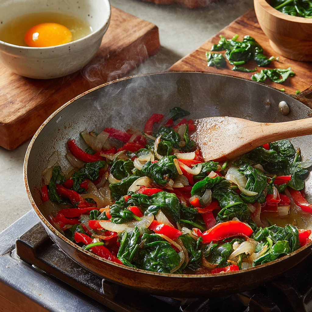 Now it’s time to add the 2 cups of chopped baby spinach right into the skillet. Stir it into the other veggies and cook for another 2–3 minutes until it wilts down. Spinach cooks super fast, so keep an eye on it—it should look soft and reduced in volume but still nice and green.