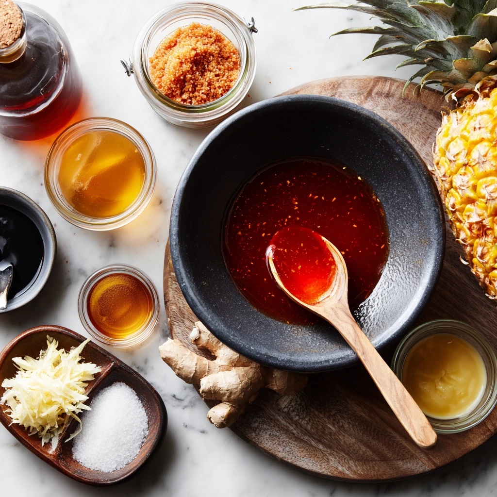 1️⃣ Make the marinade: In a medium bowl, whisk together the ketchup, brown sugar, soy sauce, pineapple juice, 2 tbsp olive oil, rice vinegar, garlic, ginger, and sesame oil. Season with ¾ tsp black pepper and salt to taste.