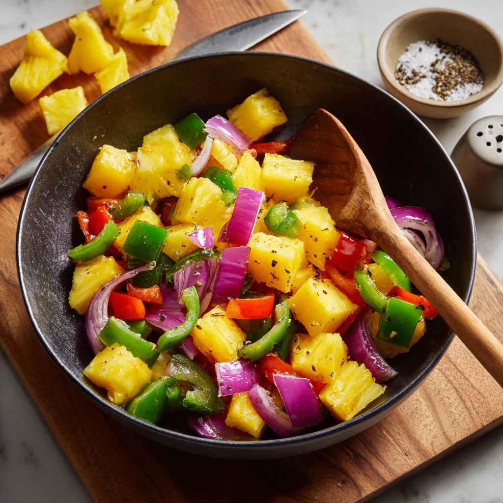 3️⃣ Prep the veg & fruit: In a separate bowl, toss the bell pepper, red onion, and pineapple with the remaining 2 tbsp olive oil. Season lightly with salt and pepper.