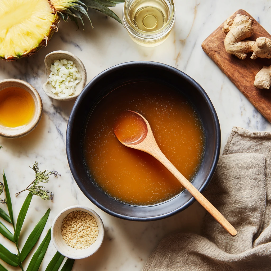 Keep whisking until the brown sugar has completely dissolved and the mixture is silky smooth. This blend of sweet pineapple juice and salty soy-based teriyaki is the secret to that unmistakable Huli Huli flavor. Pro tip: if your brown sugar is clumping, break it up between your fingers before adding it to the bowl—that way you’ll avoid any gritty spots in the finished sauce.