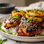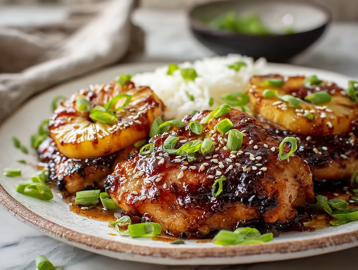 On a large serving platter, arrange the chicken thighs (or breasts) in a single layer. Top each piece with one or two caramelized pineapple rings. -